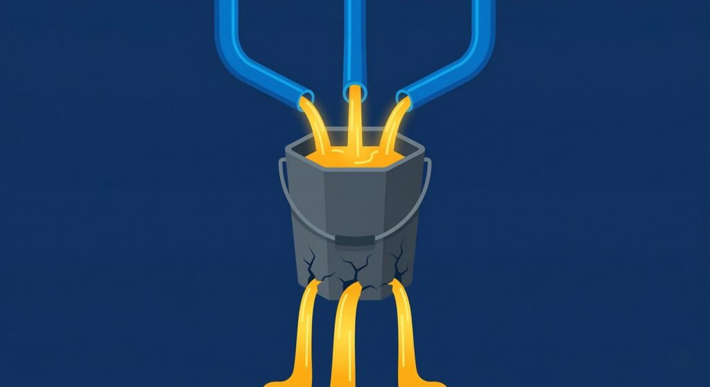 どれだけ最新の広告やSNSでアクセス(水)を大量に注ぎ込んでも、ザルから抜け落ちるように、お客さんは「なんだ、他のお店と同じか」と離脱してしまいます。 ROIを最大化したいなら、ホースを太くする前に、まずは「強力な受け皿(穴のないバケツ)」を作らなければならないのです。