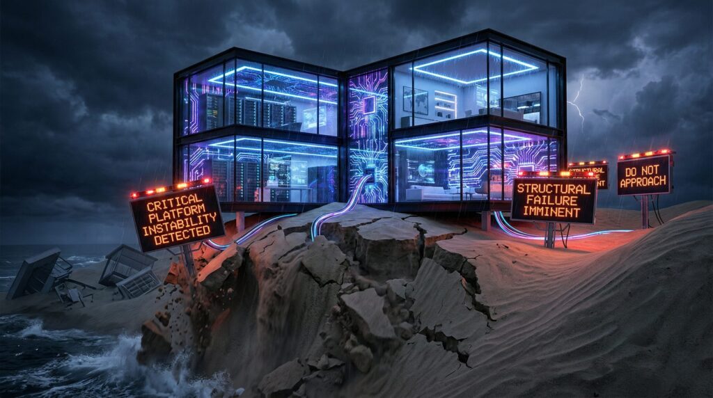 これは例えるなら、「他人の土地(プラットフォーム)の上に、大金をかけて立派な家(システム)を建てている状態」です。