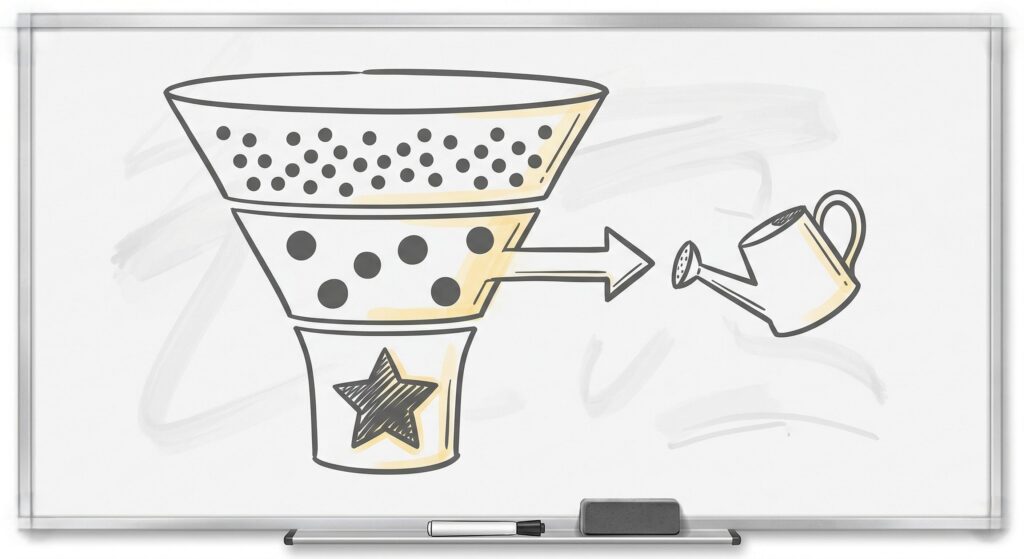 マーケティングにおいて、お客さんがあなたを知ってから、実際に商品を購入するまでの「導線」は、まさにこの漏斗の形をしています。 最初はたくさんの人があなたを知り(広く)、そこから興味を持って情報を受け取る人が絞られ(中くらい)、最後に商品を買ってくれる熱狂的なお客さんが残る(狭い)。