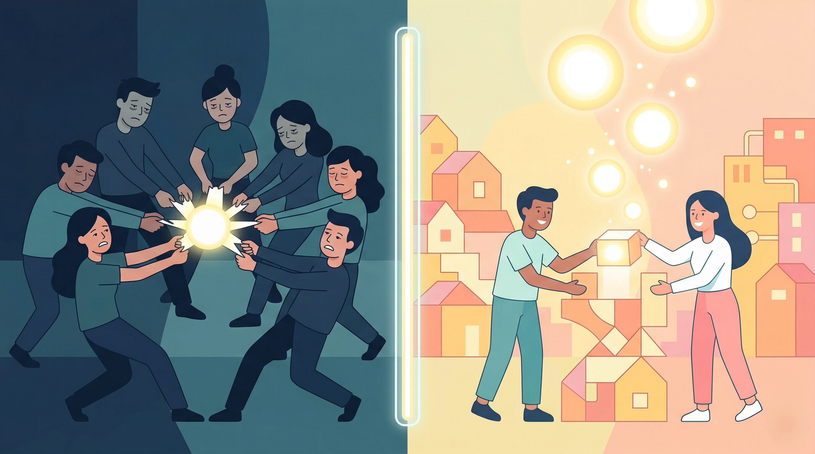 競争マインドとは何か? この考え方に囚われている人は、お金には限りがあると考えています。 例えば、相手が100あるうちの70を取ったら、自分は30しか取れないと考えている。だから、競争に勝って相手より多くの取り分を自分が得ようとするわけですね。